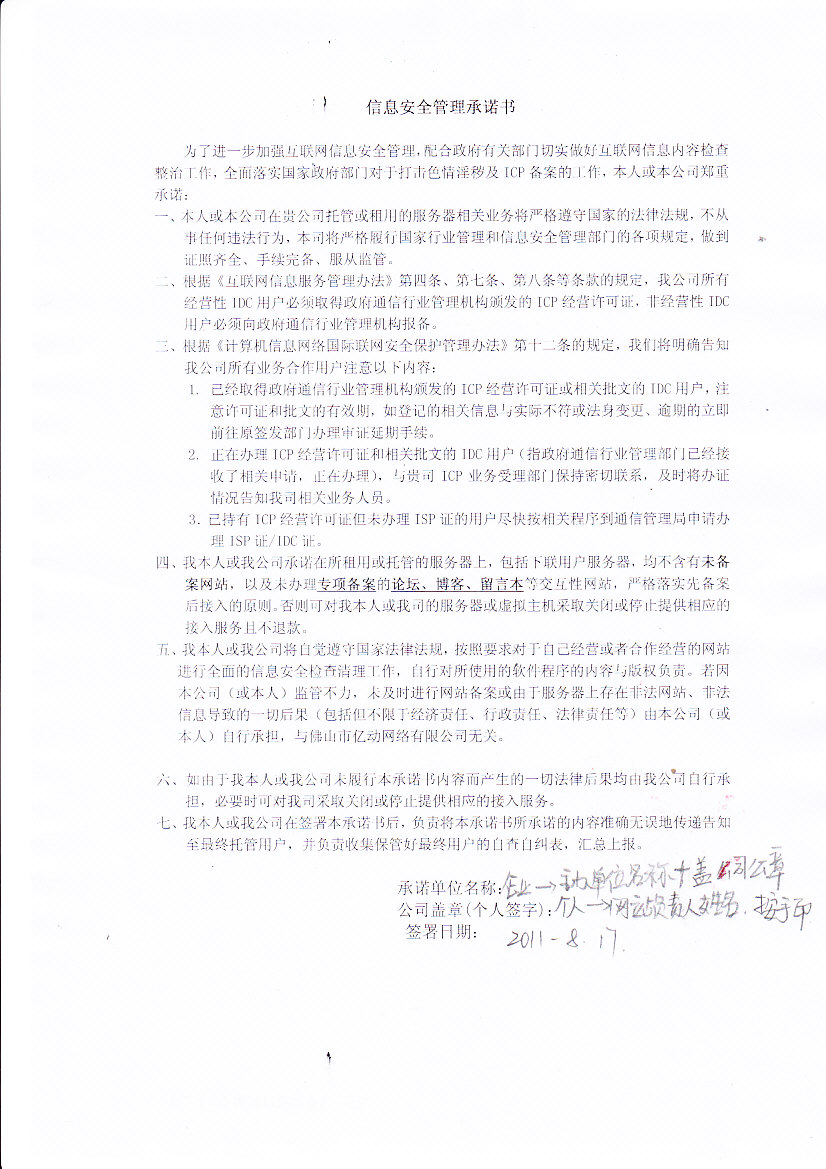 網(wǎng)站工信部備案??信息安全管理承諾書
