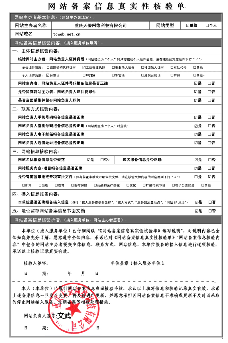 如,我們公司法人是文武,那么,網(wǎng)站備案的核驗單填寫范例如下: