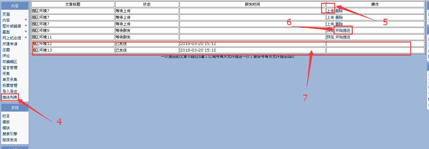 4.點擊“推送列表”,就會跳轉(zhuǎn)到此頁面。 5.點擊“上傳”次文章就會上傳到公眾號里面,但是沒有發(fā)布出去。 6.點擊“開始推送”就完成文章發(fā)布。(注:可以點擊“預(yù)覽”查看發(fā)布效果。) 7.顯示的發(fā)布成功以及發(fā)布時間。