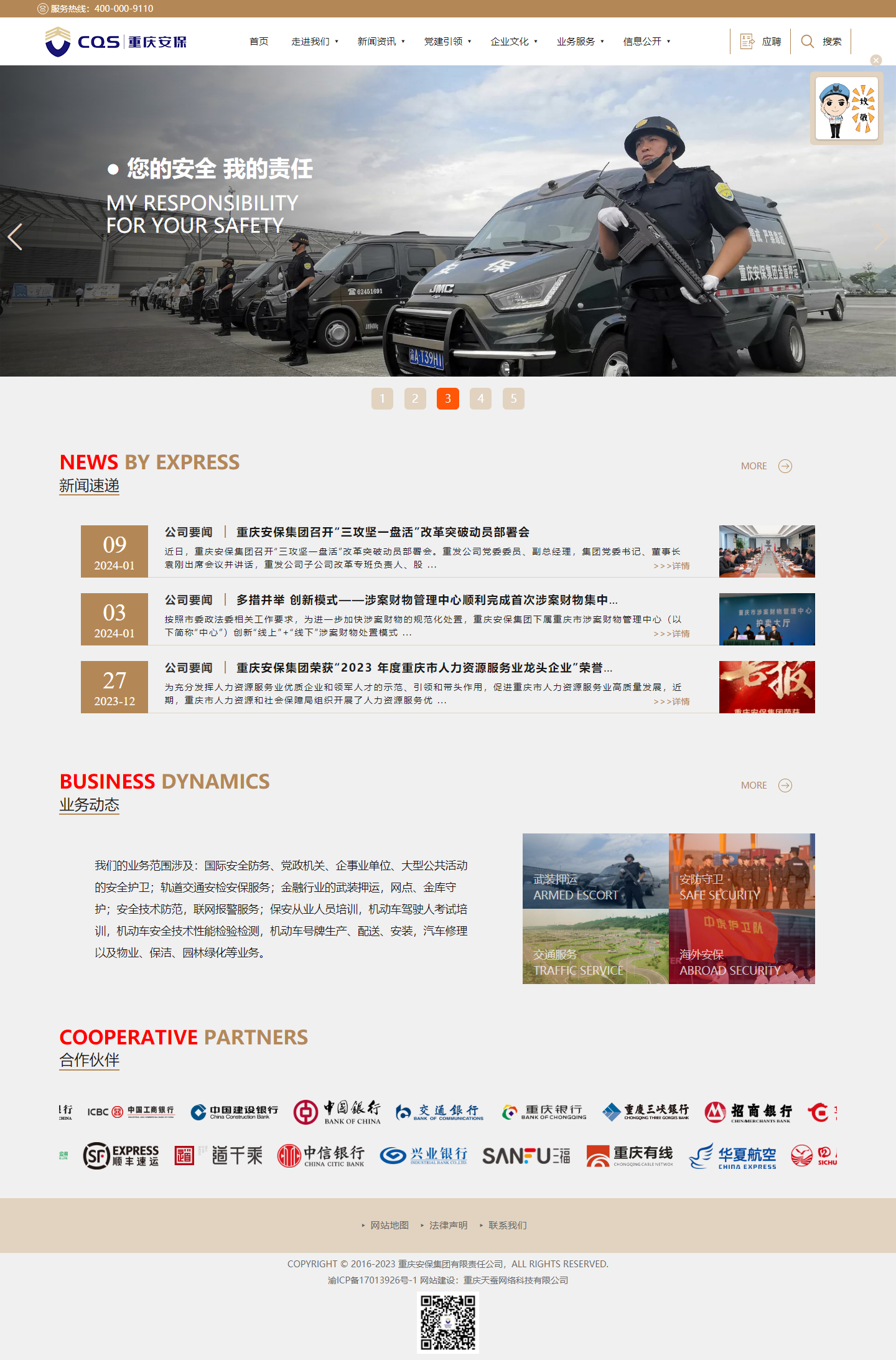 天蠶 重慶網(wǎng)絡(luò)公司小編語: 重慶安保公司成立于2011年8月,主要從事保安服務(wù)、勞務(wù)派遣、物業(yè)管理、安全技術(shù)防范系統(tǒng)設(shè)計施工、視頻監(jiān)控安裝及維保服務(wù);提供安防智能一體化解決方案。公司遵循“積極防衛(wèi)、安全第一、優(yōu)質(zhì)服務(wù)、信譽(yù)至上”的服務(wù)理念,致力于維護(hù)社會治安、維護(hù)公共安全、發(fā)揮重要輔警作用。